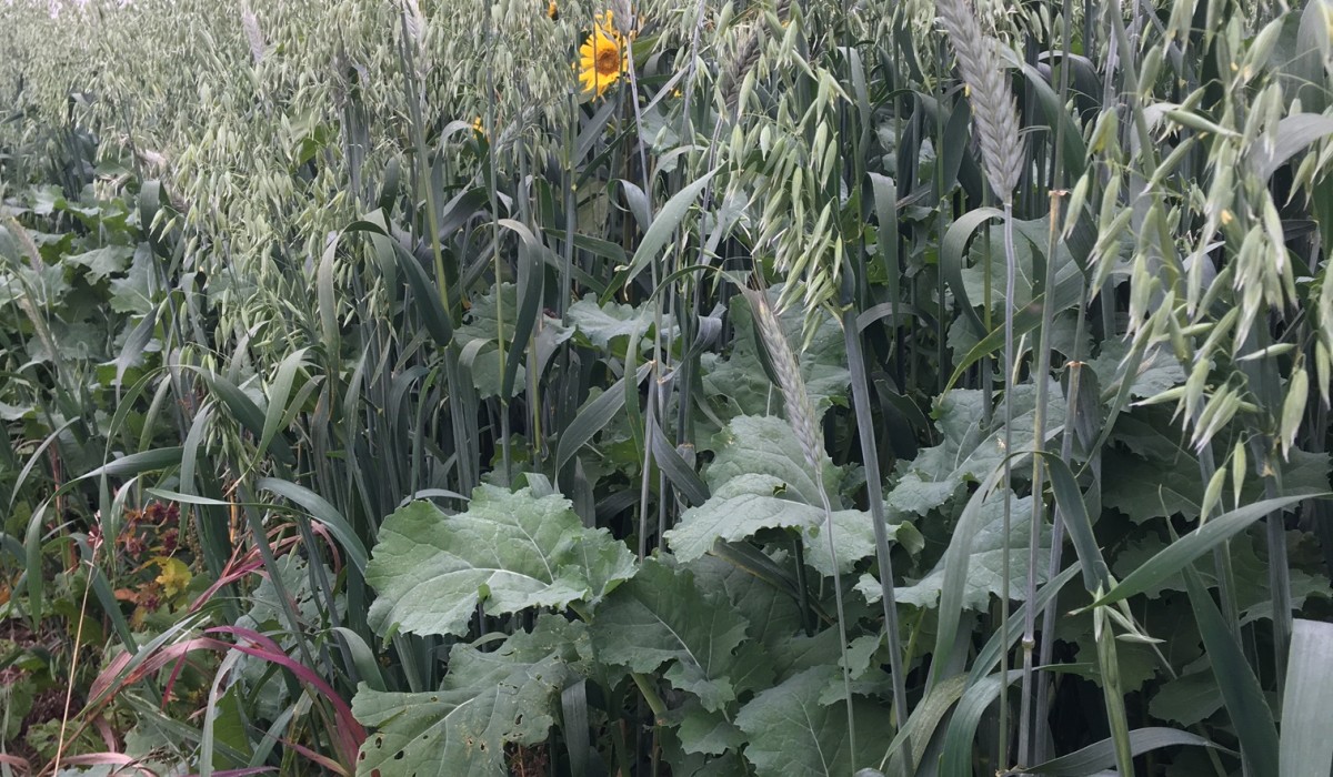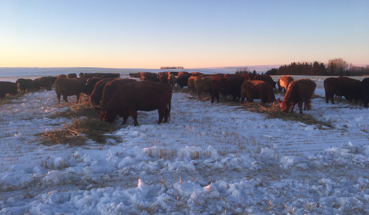 In the winter we use swath grazing to feed the cattle, using a nutrient dense blend of forage rape, turnips, peas, sunflower, triticale (grain) and oats. This blend is a high-protein and high-energy ration that provides excellent nutrition for the the cows and calves over the winter, while adding organic matter nutrients into the soil all winter long. Swaths (or rows) of feed are spread on top of the snow during winter months to allow cattle easy access to feed.